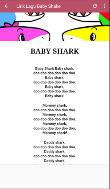 Beragam versi bahkan terus dikembangkan oleh Pinkfong. BERANDA LAGU - LAGU ANAK LENGKAP Lirik Lagu Baby Shark Lagu Anak DAFTAR ISI.